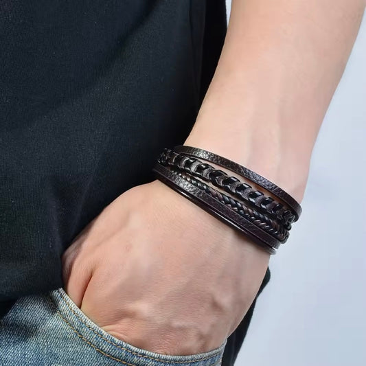 Meerlaags geweven PU-leren herenarmband, retro buitenstijl