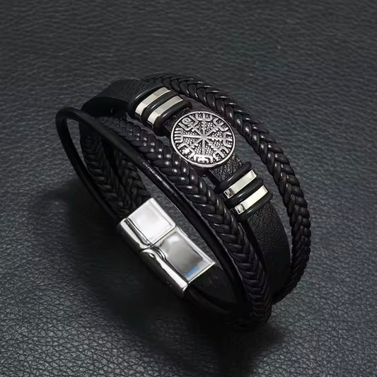 Viking Kompas Armband – Roestvrij Staal & Gevlochten Lederen Amulet met Norse Runen