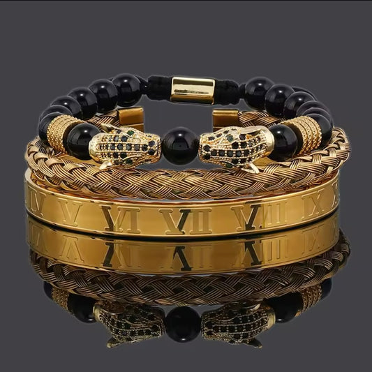 Luxe Zwarte Steen Kralen Armband â Luipaard Hoofd | Roestvrijstalen Romeinse Armband Set