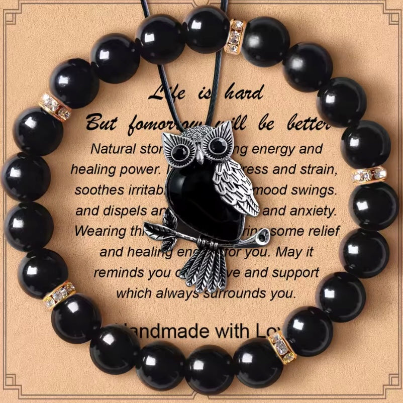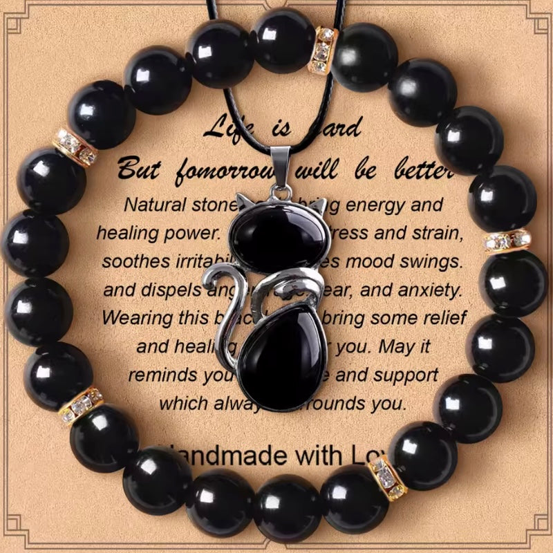 2-delige Obsidiaan Set - Armband en hanger met inspirerende kaarten, helende kristallen voor het verlichten van angst en evenwichtsbalancering van emoties