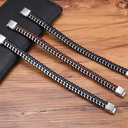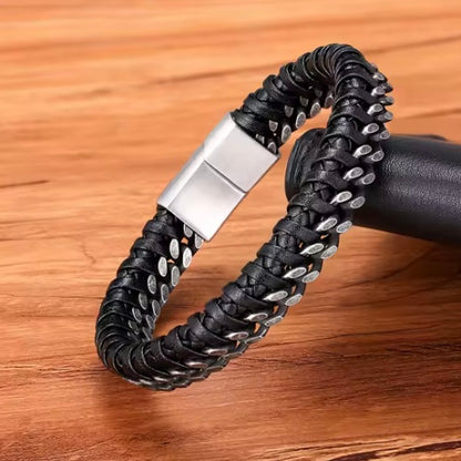 Ontdek de roestvrijstalen herenarmband met dubbele gevlochten leren ketting en magnetische sluiting.