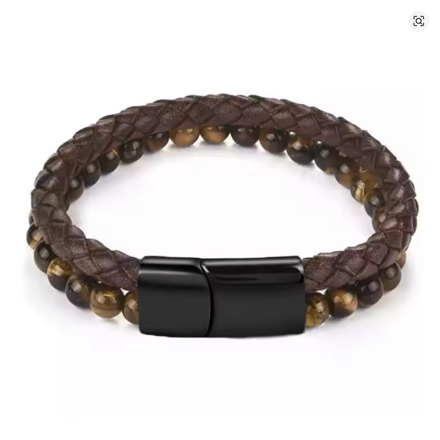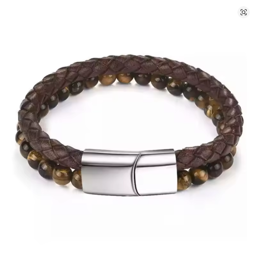 Ontdek de perfecte mix van natuurlijke gele tijgeroog kralen en robuust leer met roestvrijstalen magnetische sluiting. Handgemaakt voor kracht, stijl en comfort – dé herenarmband die opvalt.