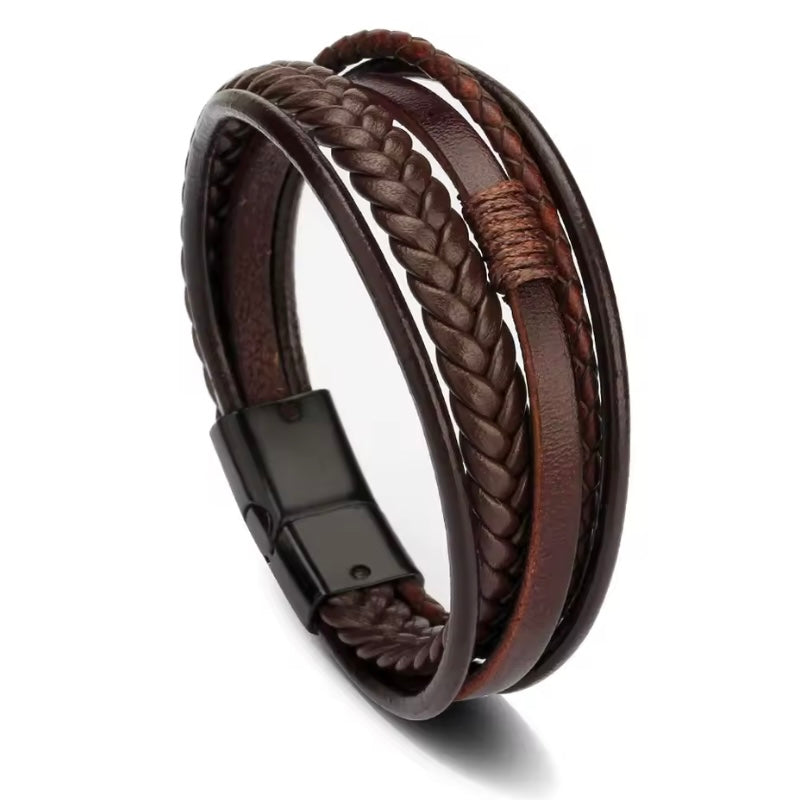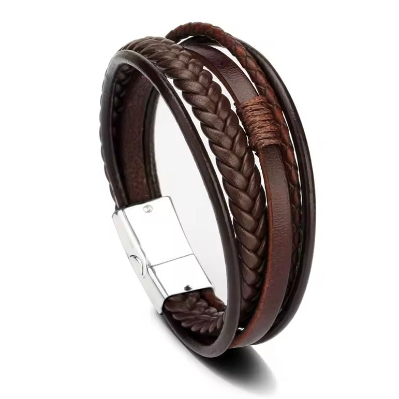 De warme kleur, het ambachtelijke vlechtwerk en de solide metalen details geven deze armband een tijdloze, mannelijke uitstraling.